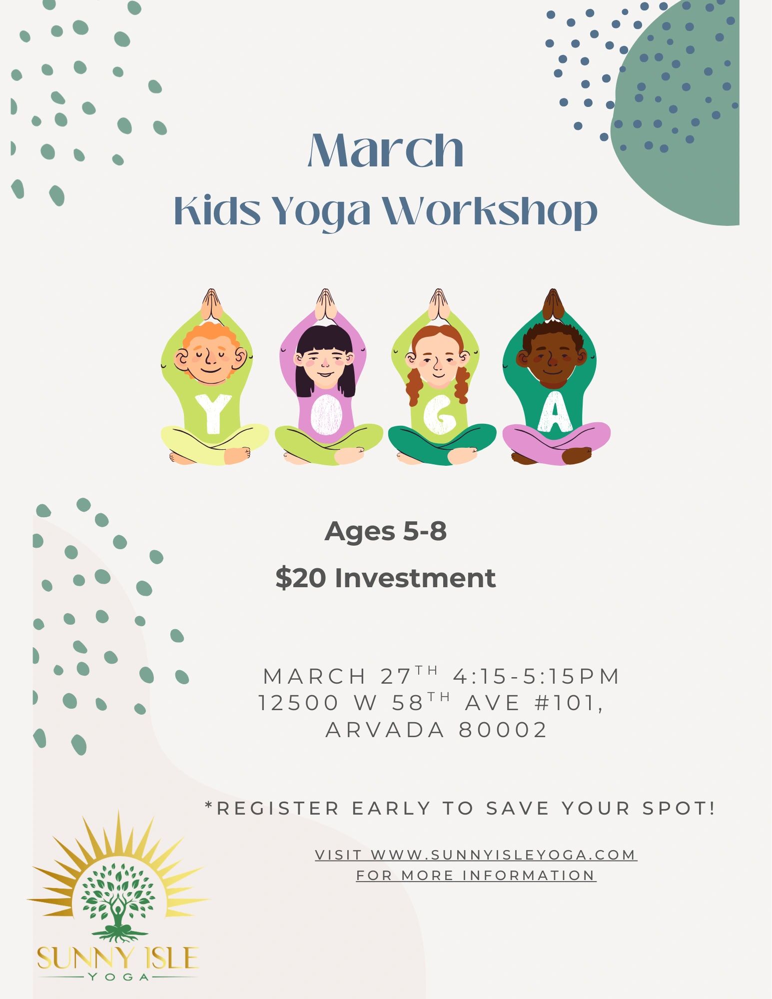 During this Kids Yoga Workshop for 5-8 year olds, your children will learn some valuable mindfulness tools that they can carry into their everyday lives to help navigate their worlds with more awareness. They will learn tools to h process their feelings through movement, quieting the mind, and breathing intentionally.