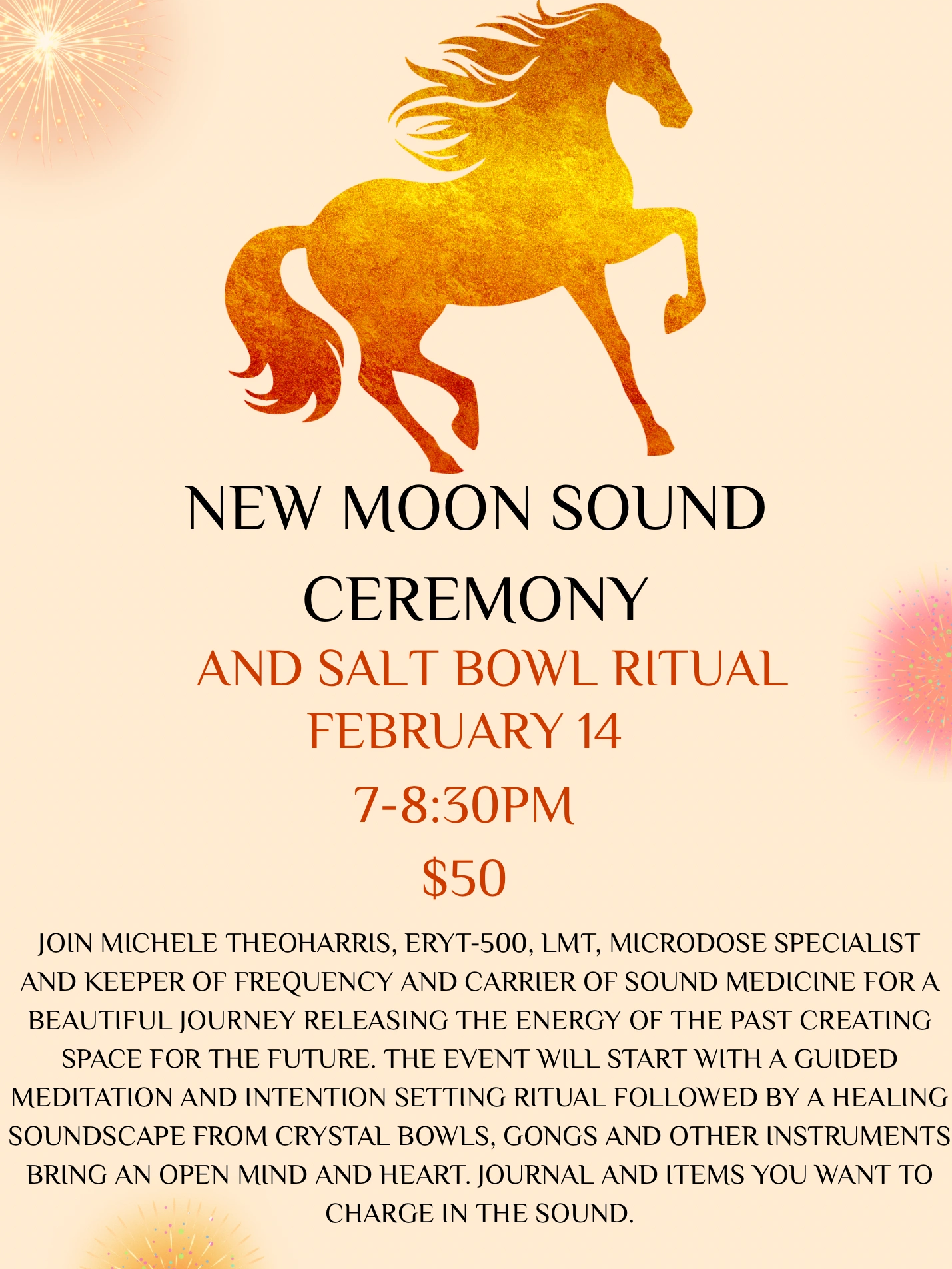 This workshop opens with a fire ritual followed by a gentle dynamic movement section to prepare the body for a relaxing 75-min sound ceremony. Gentle sounds will be played on crystal bowls, rattles, tuning forks, drums, and a gong.